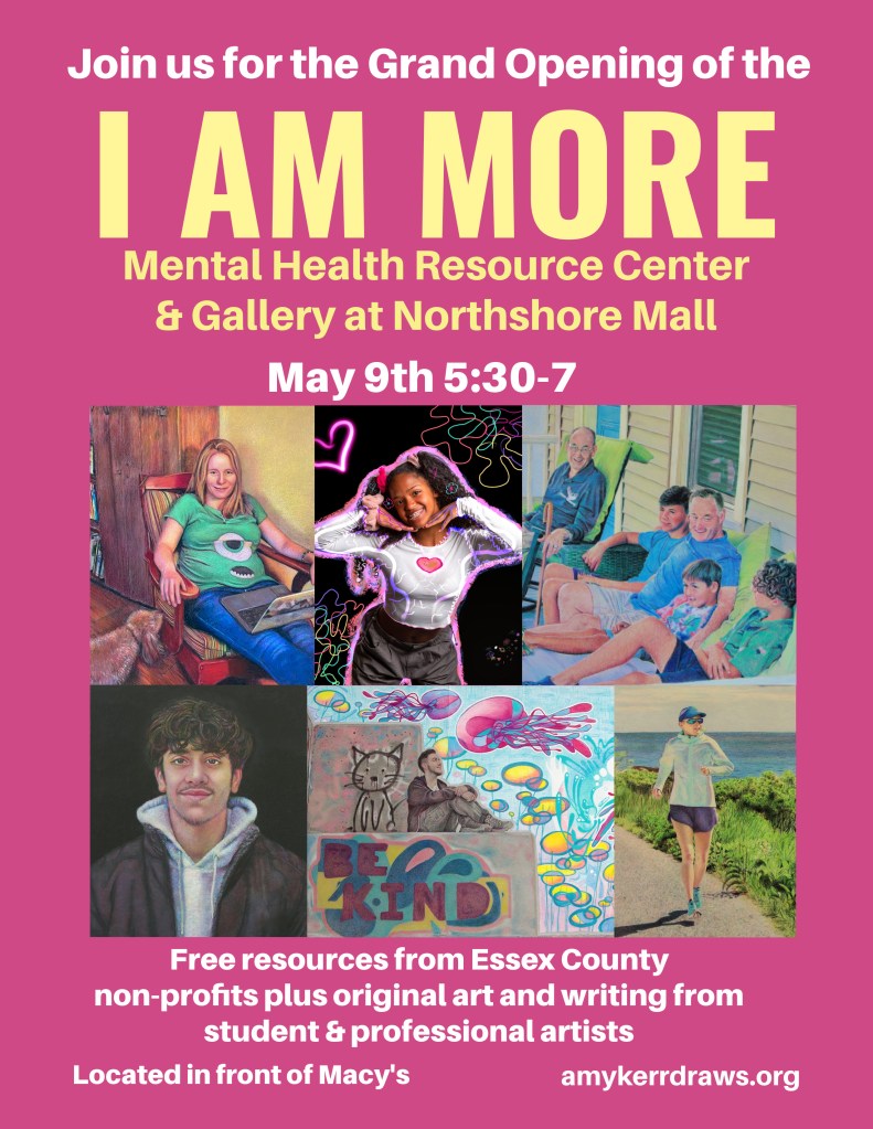 This is the mission I’ve arrived at after seven years of creating I Am More portraits and exhibitions, and Northshore Mall and Simon Malls have been my fearless partners since 2020 in getting these messages out to the most viewers possible. Beyond just my work and a couple of organizations at a location, the new I Am More Mental Health Resource Center & Gallery at Northshore Mall will feature the resources of ten organizations, professional artists, student artists, and new I Am More portraits.