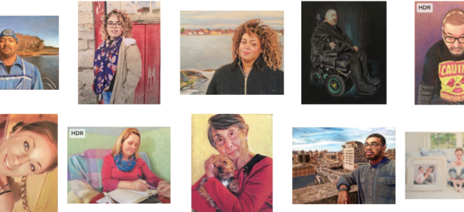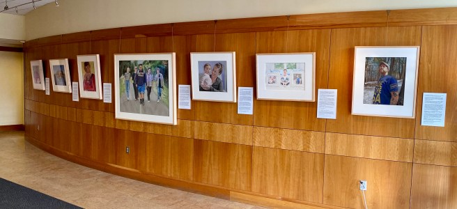 There are two tired individuals in this house (and one tired dog with no excuse). Today we put up our biggest exhibit ever, with all 36 I Am More portraits and essays at the Salem State University Berry Library. Between breaking down the Paint Factory exhibit, wrapping, renting a van, loading, driving back and forth to Salem, unloading, PR (thanks Áine!), hanging (thanks Chris!), dog care (thanks Ulla!), graphic design (thanks Dylan!), all the way down to the details of cleaning and leveling the portraits, these two people are pooped.